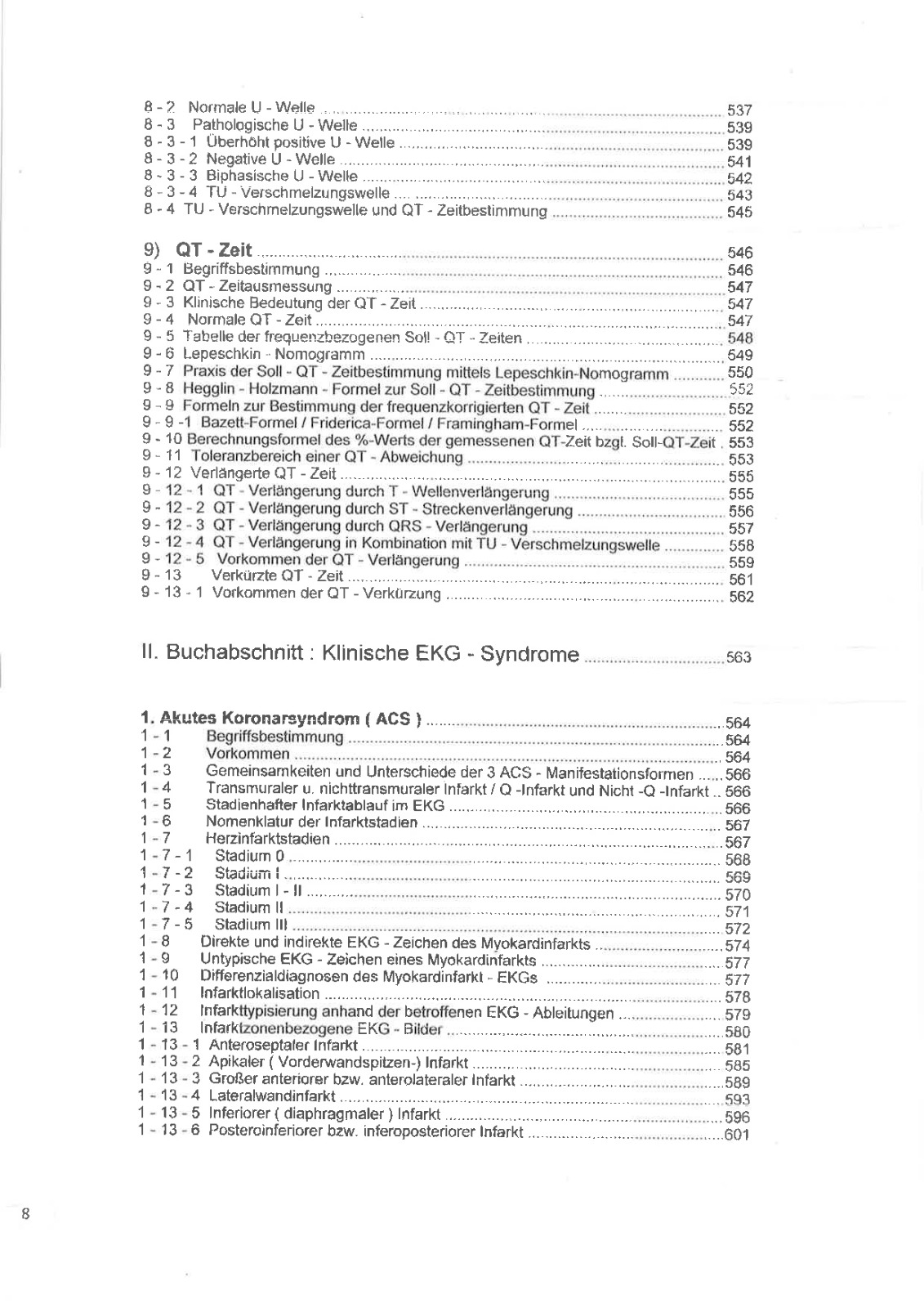 Im Buchabschnitt II werden in alphabetischer Reihenfolge siebzehn klinische EKG-Syndrome abgehandelt, vom akuten Koronarsyndrom bis hin zur Vagotonie. Allein das so wichtige ACS-Thema ist mit 77 Seiten fast schon für sich selbst ein eigenes „Büchlein im dicken Buch“, darin 50(!) ACS – EKGs, die Infarkte dargestellt in all ihren Lokalisationen und Stadien.