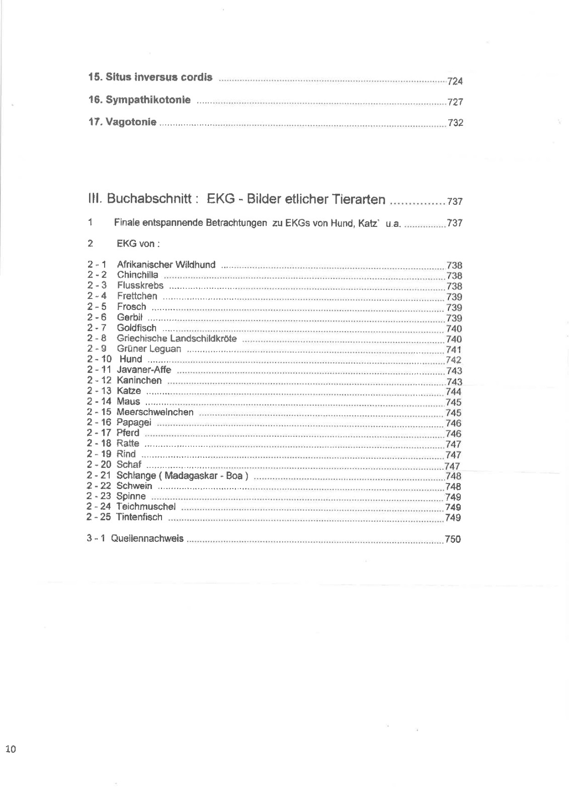 Im kleinen Buchabschnitt III wird noch zum Spaß etwas in keinem anderen Buch zu Sehendes gezeigt, nämlich die EKGs von 25 Tierarten, darunter die „Herzströme“ unseres Hundes Cilli und unserer Katze Otti.