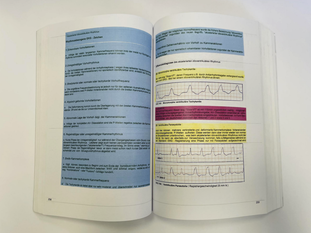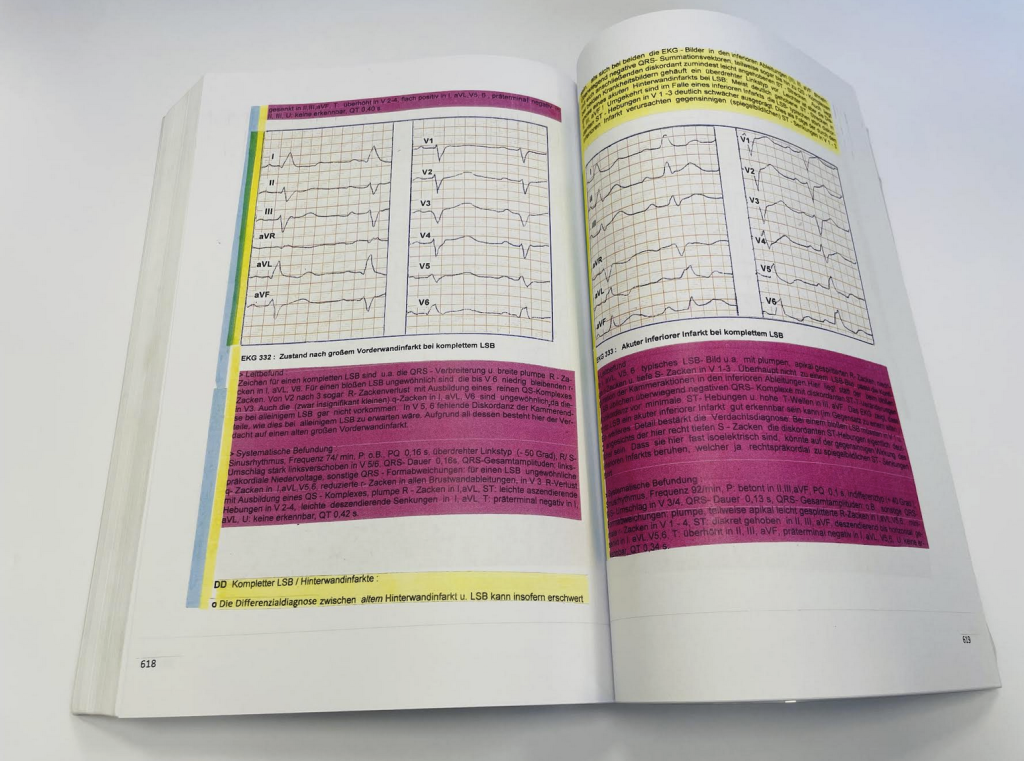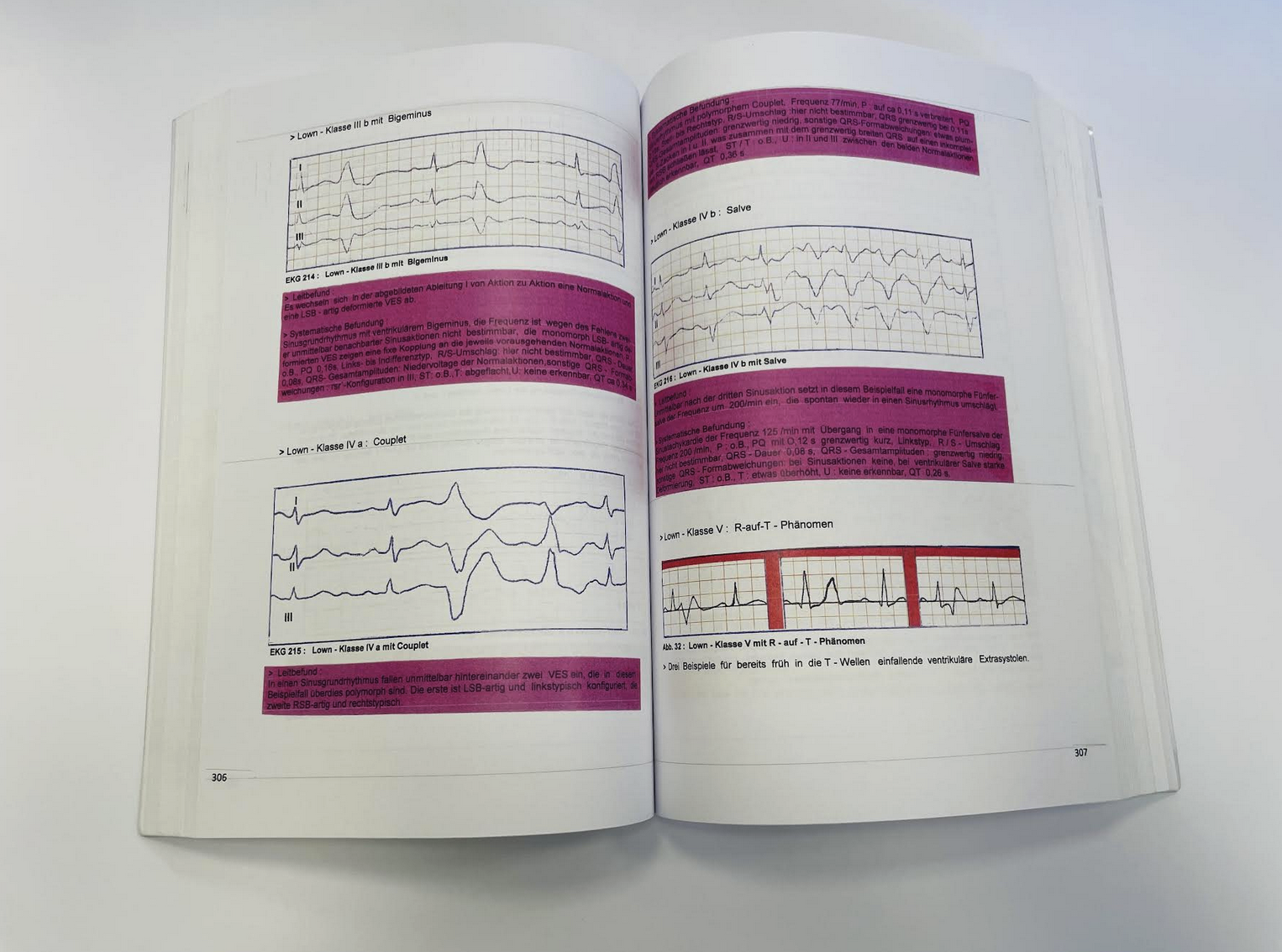 In 143 schematischen „Abbildungen“ werden die für eine EKG-Analyse relevanten Sachverhalte veranschaulicht. Zur Erleichterung der Orientierung sind die Textpassagen mit drei verschiedenen Kennfarben hinterlegt: bzgl. konkreter EKG-Zeichen verschiedenster Herzerkrankungen, bzgl. der schriftlichen EKG – Befundung und bzgl. der differenzialdiagnostischen Erwägungen.